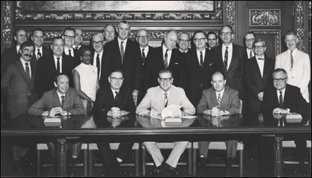 Elmer Lee Anderson, the thirtieth governor of Minnesota, was born in Chicago, Illinois on June 17, 1909. His education was attained at Muskegon Junior College and at the University of Minnesota, where he earned a business degree in 1931. He established a successful career with the H.B. Fuller Company, first working in the marketing department and eventually becoming the owner and president of the company. Andersen entered politics in 1949, serving as a member of the Minnesota State Senate, a position he held ten years. He next secured the Republican gubernatorial nomination and was elected governor by a popular vote on November 8, 1960. During his tenure, a fair housing bill was sanctioned; a statewide sanitary law was authorized; highway safety measures were initiated; and a governmental ethics act was instituted.*
